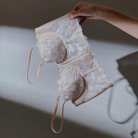 • Lace, no appliqués, basic solid color, underwired, hooked, inside with stays. 61% Polyamide, 39% Viscose.