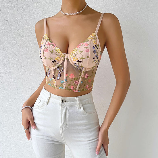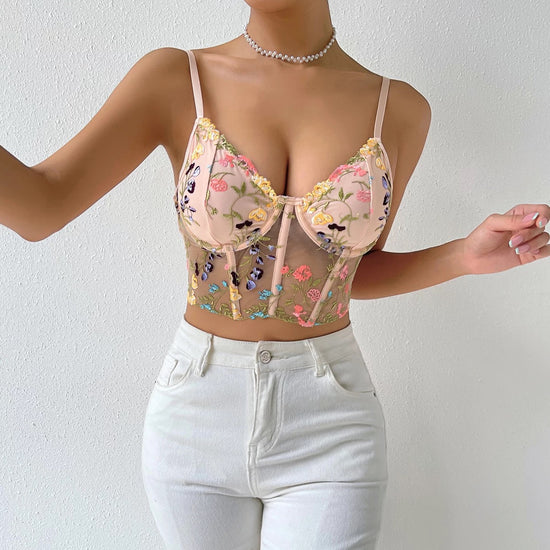 Rosalie Silk Embroidery Mesh Bustier - Black