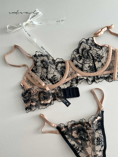 Bellaze Embroidery Two Piece Lingerie - Black Champagne