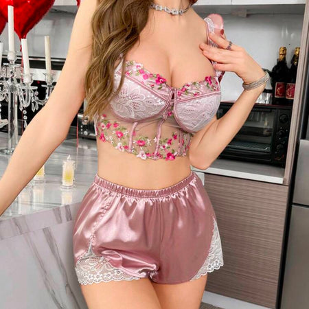 Blossom Silk Embroidery Pajamas - Dusty Rose