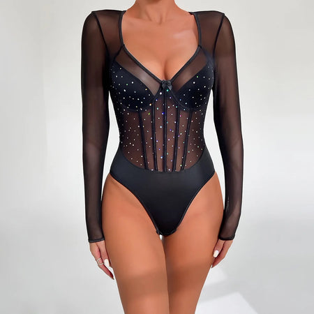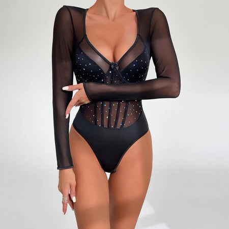 Lucy Mesh Sparkling Long Sleeve Bodysuit - Black